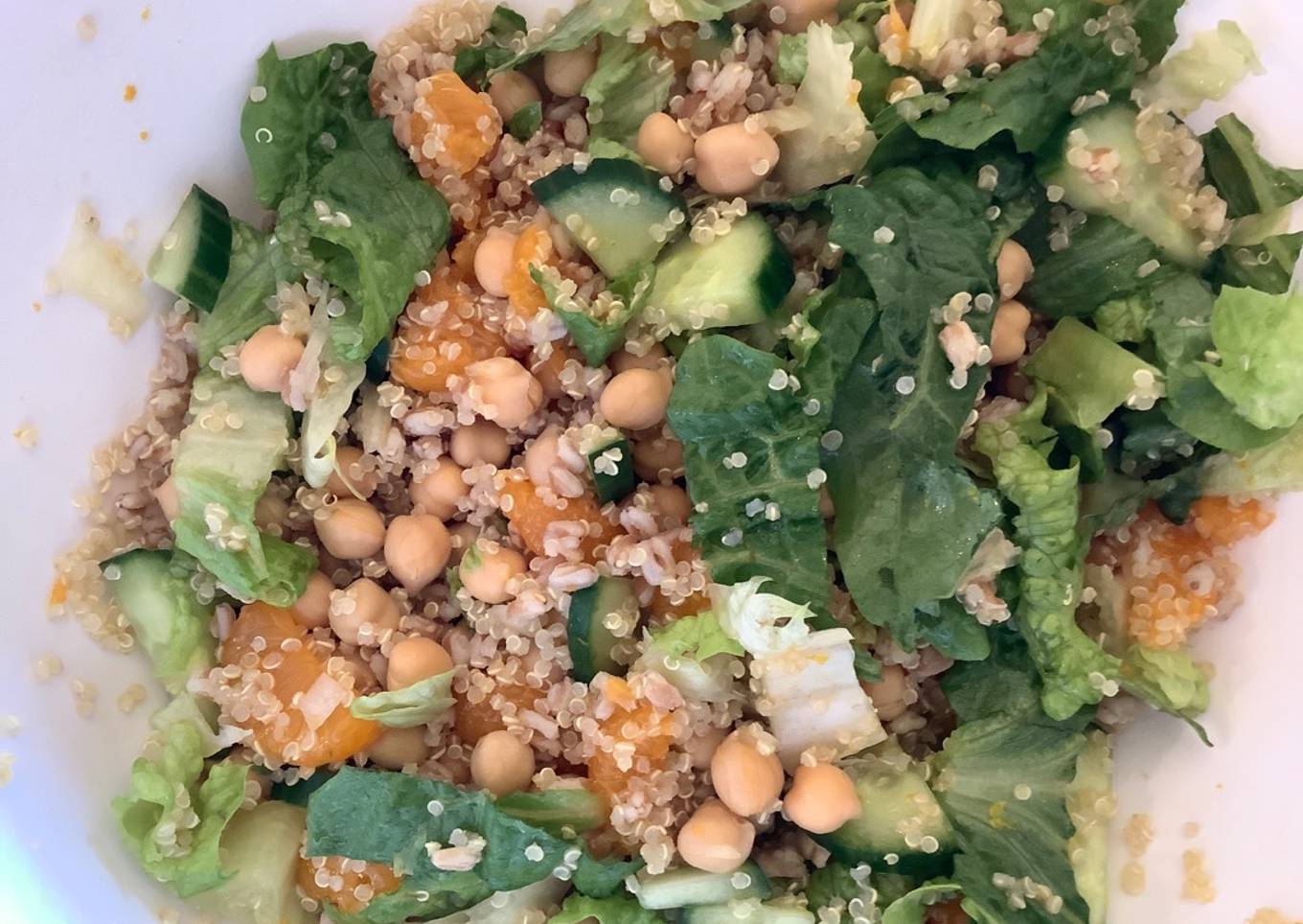 - In a large bowl combine lettuce, beans, mandarin oranges,cucumber, onion, and cooled quinoa/ farro. In a small bowl add some finely grated zest from the orange and then squeeze juice from orange into bowl. Whisk in oil, salt and pepper. Add to salad and mix.