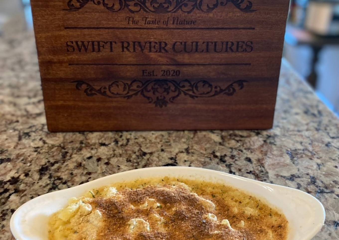 - Once it all mixed to a creamy texture add to the glass dish, cut multiple slabs of butter over the top and then cover with a single layer of American cheese
